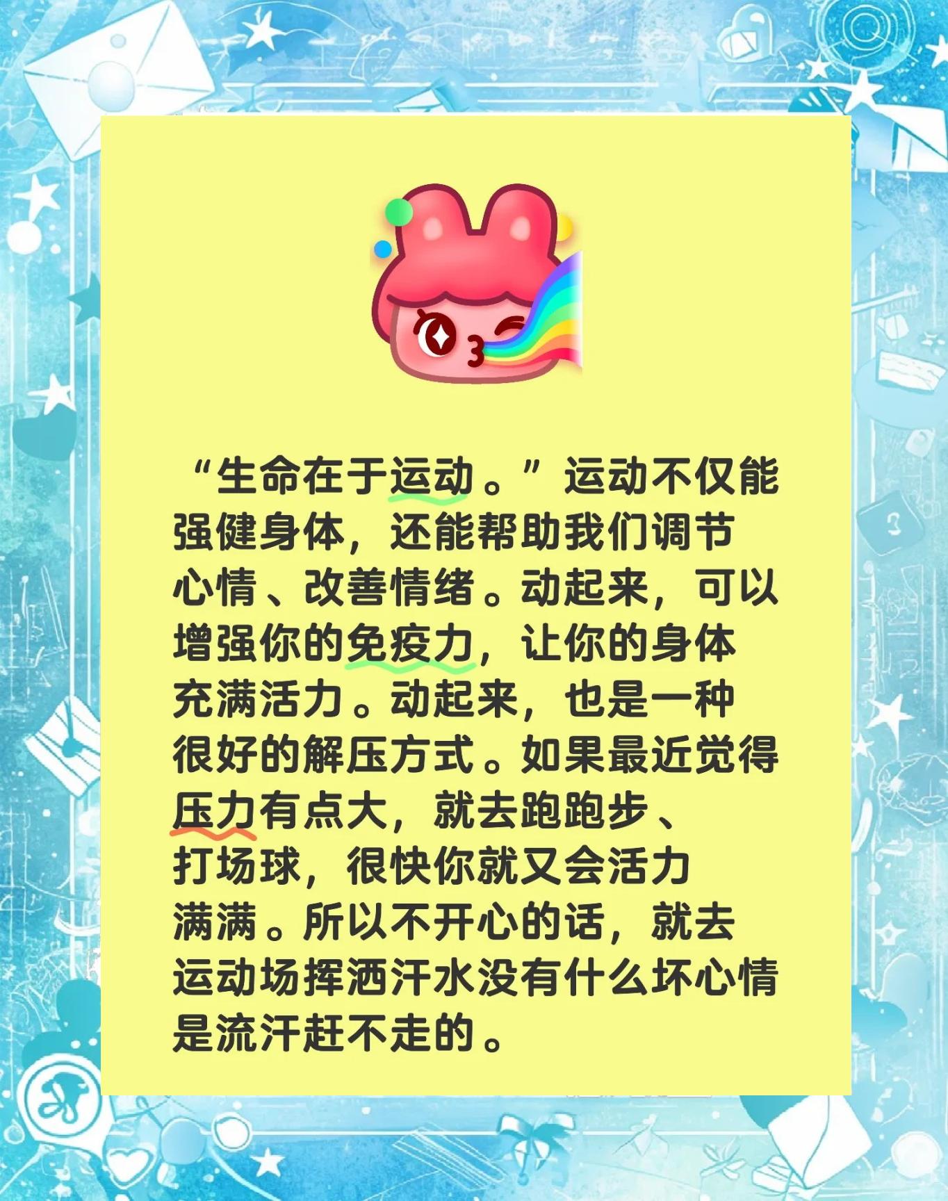 1 树立自信心教练员应指导帮助青少年击剑运动员控制自身的心理变化, 尤其是紧张心理, 使之在日常体能训练对抗训练中, 逐渐树立起自信心如找一些比赛经验丰富的运动员与其对抗性比赛训练, 在不断提高青少年运动员紧张心理的同时, 培养其能够在高度紧张的对抗性训练中逐步形成一种自我心理调整能;往往是事业成功的关键2抛弃自卑自卑需要三个条件一是缺乏成功的体验二是缺乏客观公正的评估三是自我评估偏颇要抛弃自卑,首先要战胜自我,为自己树立一个目标,要有坚强的信念,相信自己的能力,同时要对自己有一个科学合理的评估3增强自信4心理调节和情绪调节5心理训练;除了禁止17岁以下的选手参加成年组别的国际比赛外,还有其他一些措施可以保护青少年花滑运动员的身心健康1合理安排训练时间和强度 训练是花滑运动员提高技术水平的关键,但过度的训练会给年轻的运动员带来很大的压力因此,教练需要合理安排训练时间和强度,确保运动员有足够的休息时间,避免过度训练2关;疏导青少年的心理健康需要采取多种方法,以下是一些建议1倾听和理解首先,要倾听青少年的心声,理解他们的感受和困惑给予他们充分的关注和支持,让他们感受到被理解和被接纳2引导情绪表达鼓励青少年表达自己的情绪,无论是快乐悲伤愤怒还是恐惧帮助他们学会识别和表达自己的情绪,从而更好地应对情绪波动3;由此可见,培养孩子 健康 的心理素质特别重要,远胜过给孩子大量的金钱和财富反对方方日记的,我建议孩子多读经典文学作品支持方方日记的,我建议他们带领全家老少,天天背诵方方日记培养孩子的兴趣,最简单是读书,也可以是画画书法弹琴试试让他她写日记,日常所思所想都可以随心而发,既锻炼写作;关注 展开全部 1致长跑运动员也许你心理忐忑不安我们的心理早已热血沸腾昔日长长的跑道上留下了你深深的足迹抹不去你渗出的汗水拉不动你沉重的双脚你为分院不在乎自己的疲倦不在乎汗水和泪水因为你心里有一种坚定的信念2致裁判员老师A致裁判员老师也许,震天的呼声于你们无缘,但,挚起那片欢呼声的是你们的;2现场指导青少年摔跤运动员出现心理素质问题大多数是在摔跤比赛的现场,所以现场指导与运动员心理素质的提高也是密不可分的赛前教练员对运动员的动员,明确这次比赛的目标和任务,树立起比赛的责任感和荣誉感,消除运动员心理上的过分紧张和担忧,对比赛产生十足的把握教练员还要向运动员罗列清晰;关注 展开全部 #报告# 导语总结报告是对过去工作的回顾和评价,因而要尊重客观事实,以事实为依据以下是 考 网整理的心理健康教育总结报告,欢迎阅读! 1心理健康教育总结报告 在上级领导的重视,大力支持下,为使学校的心理教学能够适应基础教育改革的发展需要,提高全体学生共性的心理品质,开发学生的心理潜能。
